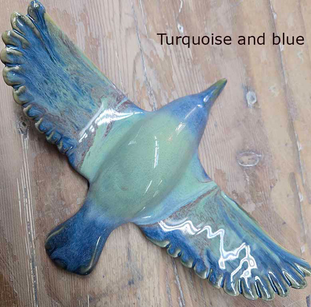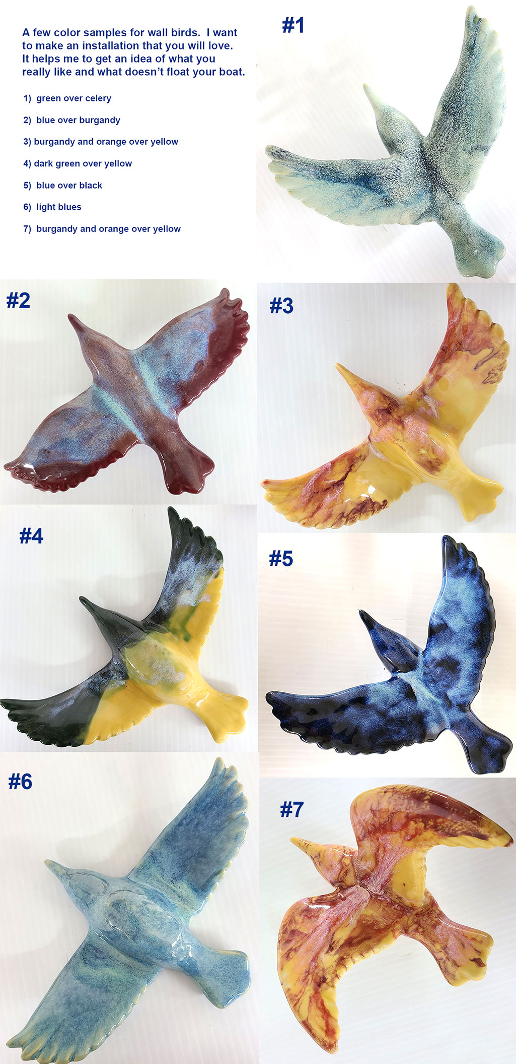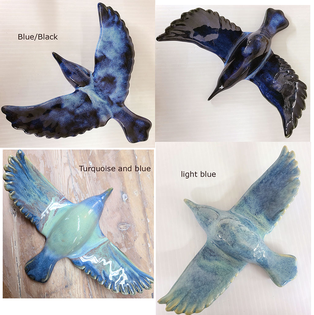 These are a few of the glaze color options that are available for installation birds. Feel free to pick your favorite color option, and I can work with you on bird installation styles.