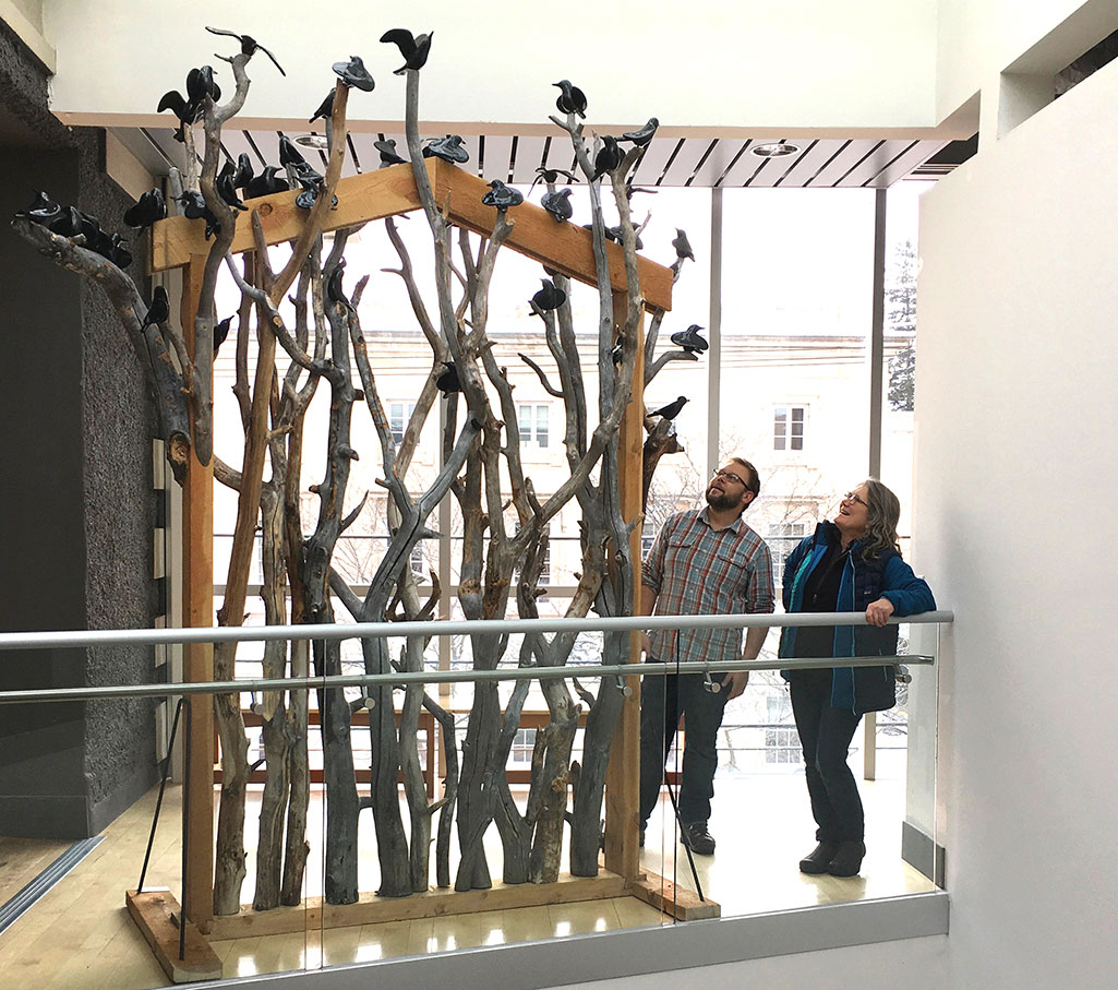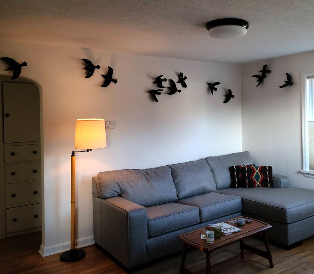 My installation pieces are typically made up of either dipped or craved ceramic birds, but I am able to also use my narrative birds in installations.